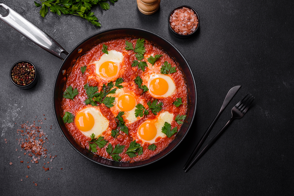- Розбий яйця поверх томатів. Посоли та поперчи, підсмажуй на середньому вогні 3–5 хвилин до потрібного ступеня готовності. Посип зеленню і на хвилинку накрий кришкою, щоб аромат став яскравішим. Зніми з вогню і подавай.