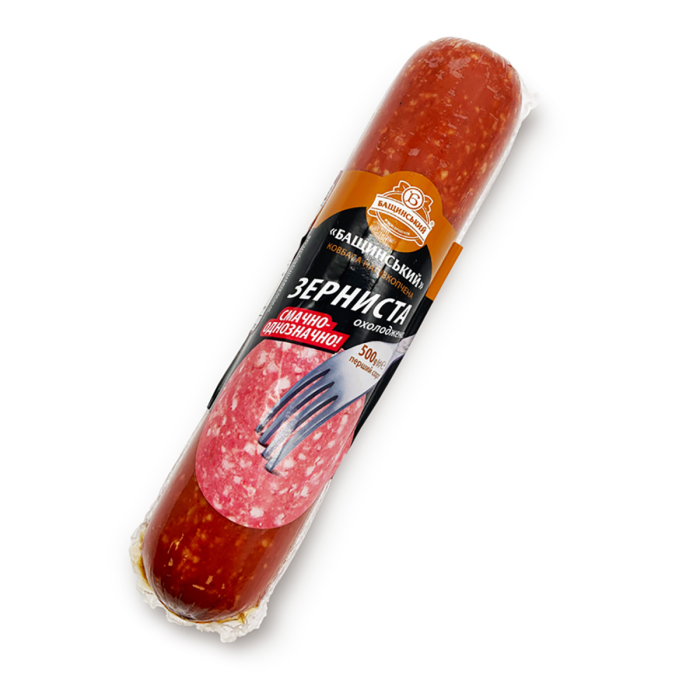 Ковбаса «Зерниста» напівкопчена від ТМ «Бащинський» в упаковці 0,5 кг першого ґатунку — м’ясний виріб високої якості, виготовлений за традиційними технологіями. Завдяки використанню якісного м’ясного фаршу, ця ковбаса має багатий смак і виражений м’ясний аромат.