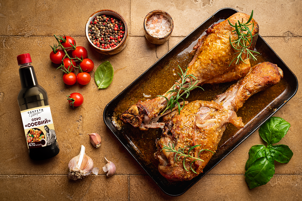 - Візьми 100 мл соєвого соусу, додай 2 столові ложки гірчиці, 1 чайну ложку меду та 1 столову ложку рослинної олії. Усе збий блендером, при бажанні присип сушеними травами провансу.