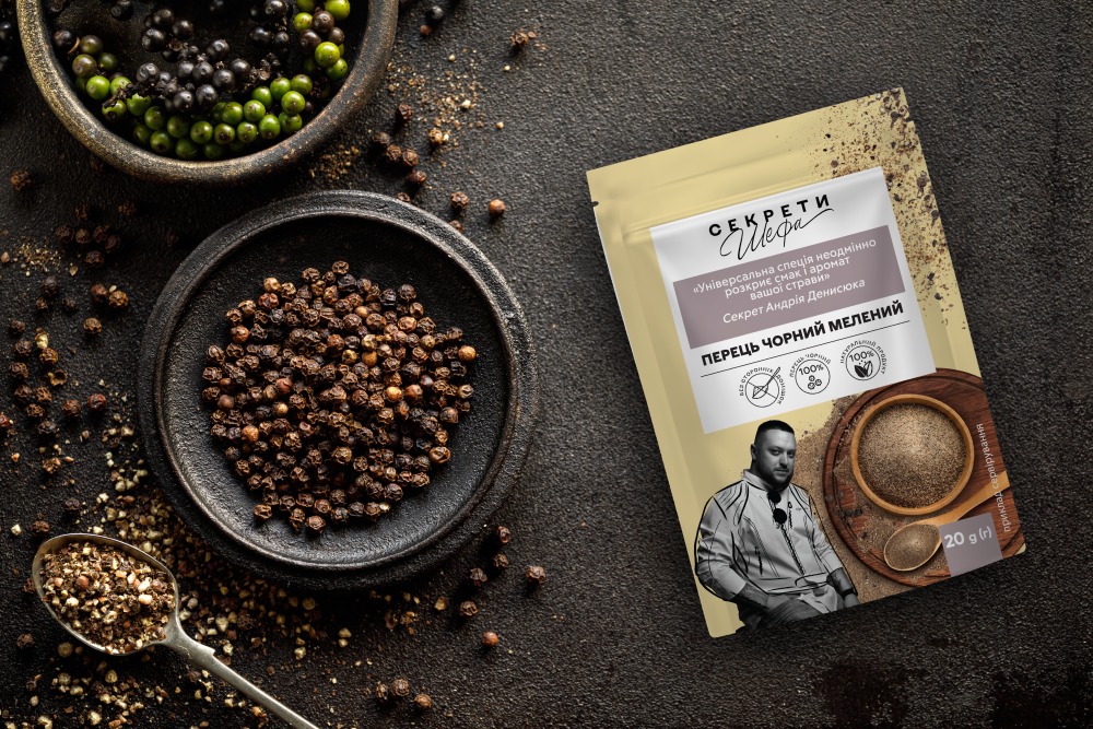 Мелений або горошком, чорний перчик використовується в національних кухнях усього світу. Його можна класти практично в будь-яку страву — з м'яса, риби або овочів. Досвідчені кулінари купують перець горошком, а за необхідності розмелюють його в спеціальному млинку. Річ у тім, що в зернятках ароматні олії зберігаються довше, надаючи стравам більш насиченого смаку. Однак, якщо в тебе немає млинка або часу на помел, просто купи мелений перчик "Секрети Шефа".