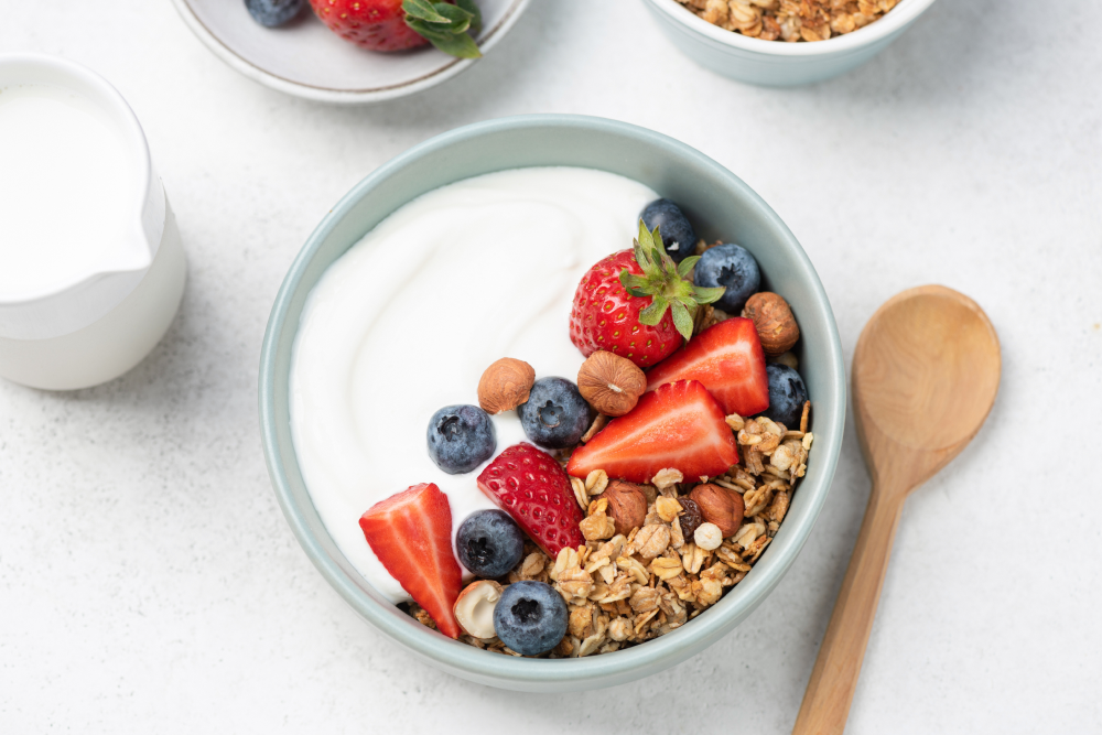 На сніданок грецький йогурт чудово доповнюють ягоди, горіхи та сухофрукти.